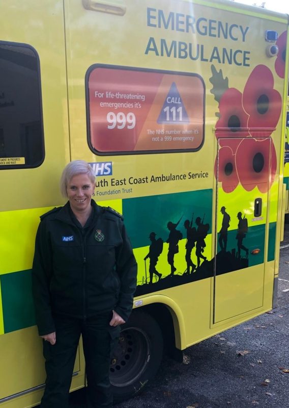 Nicola Sykes with a SECAmb vehicle in Remembrance livery.