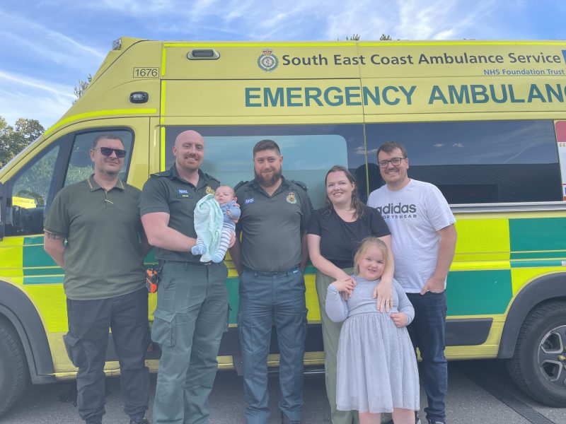 On Monday, 29 September, new parents Becky and Nathan visited Ashford’s Make Ready Centre with their two-month-old son, Elliot, to thank Paramedics Aidan and Richard, and Emergency Medical Advisor (EMA), Adam, who together safely delivered Elliot at the family’s home on 1 August 2025.