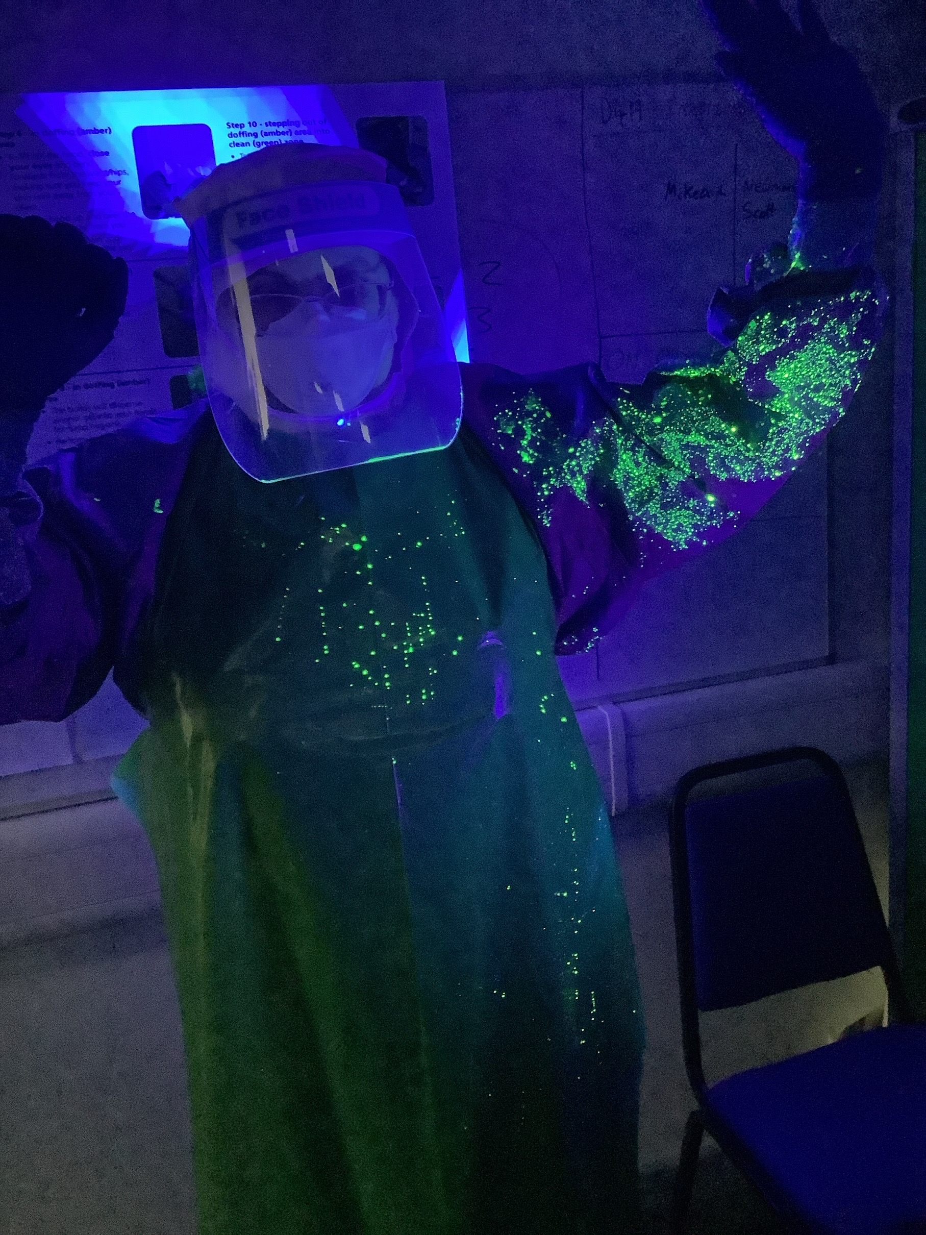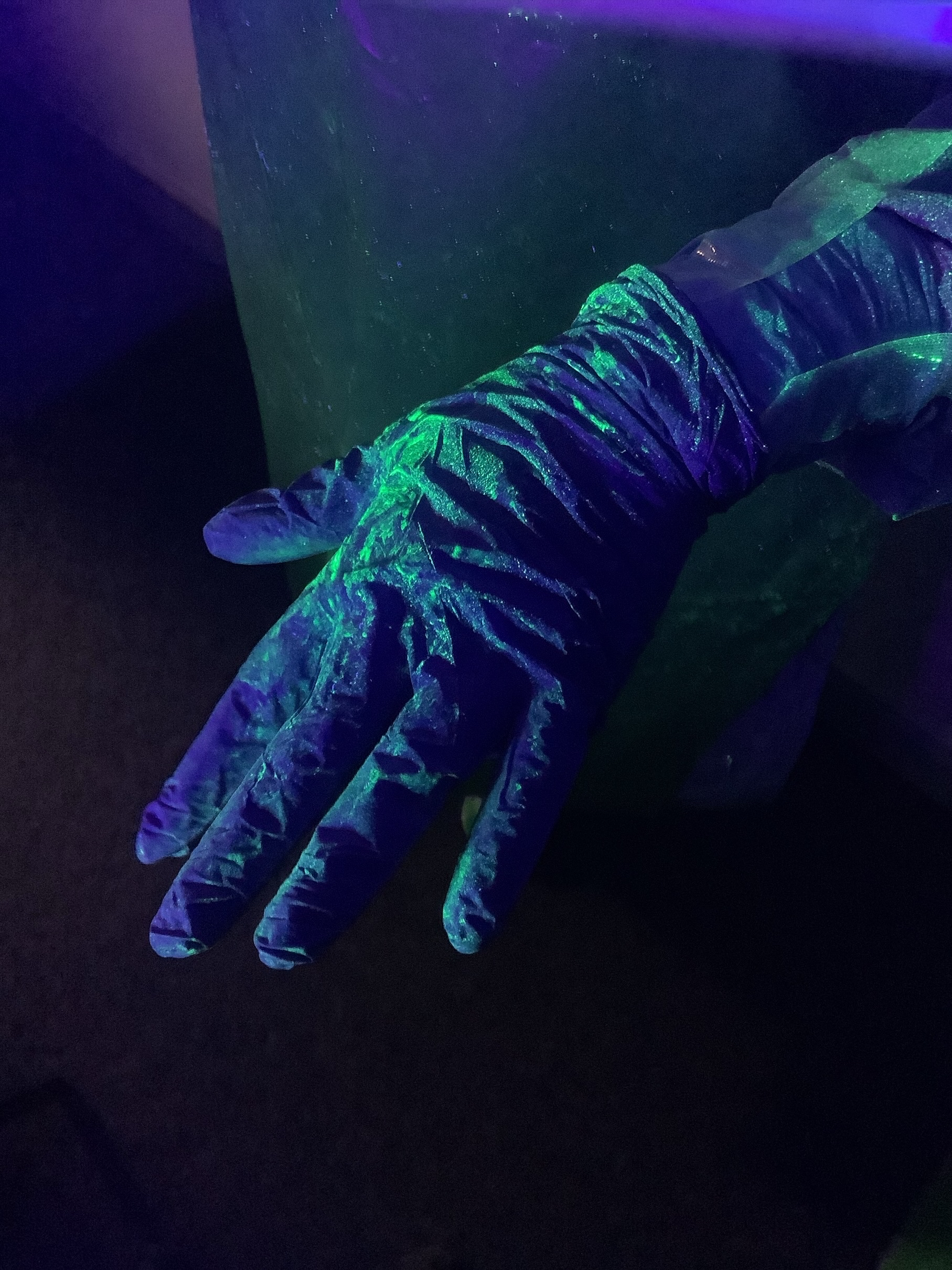 - A PPE glove under ultraviolet light reveals the training spray.